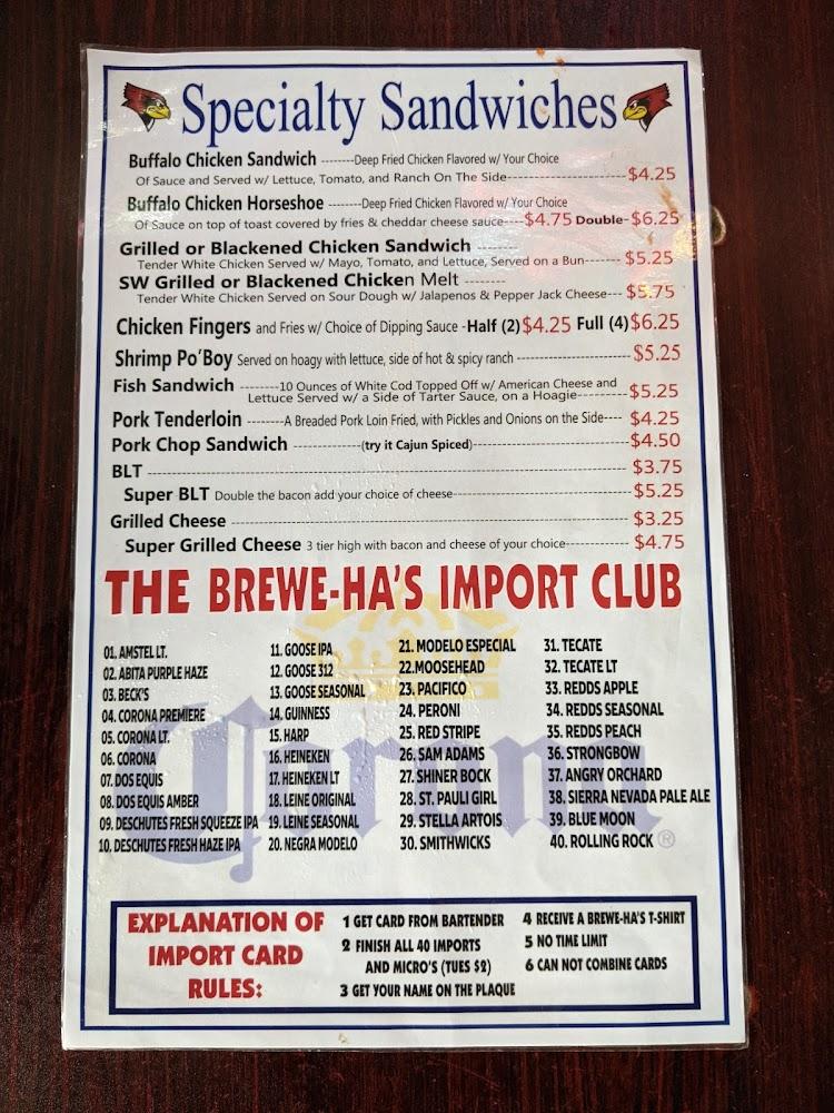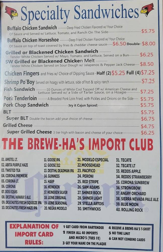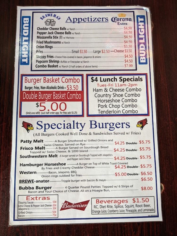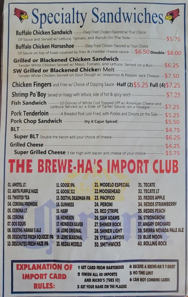 The menu at Brewe-Ha's is an enticing mix of comfort food and specialty items, catering to various tastes. With an average meal priced at $6.33, it's easy to enjoy a filling meal without breaking the bank. Highlights include specialty burgers like the Brewe-Anator and a range of sandwiches like the Buffalo Chicken. Appetizers such as cheddar cheese balls and fried mushrooms provide perfect starting points. The craft beer list also enhances every dish, ensuring guests can find a perfect pairing. Altogether, the carefully crafted menu invites all to indulge in hearty plates while enjoying local brews.